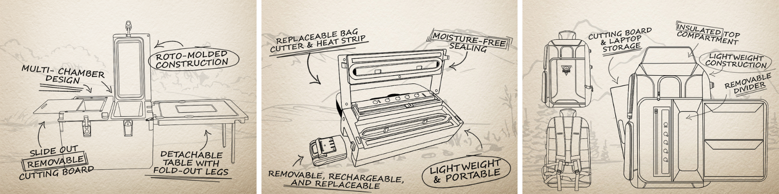 Our coolers double as workstations with slide-out cutting boards detachable tables. Paired with the portable vacuum sealer, they make prepping, preserving, and enjoying fresh food outdoors effortless.