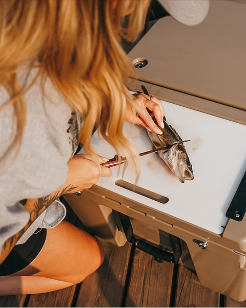 The cooler features a convenient cutting board that slides out and can be removed easily. Its spring-loaded connection points allow access while the cooler is open or shut.
