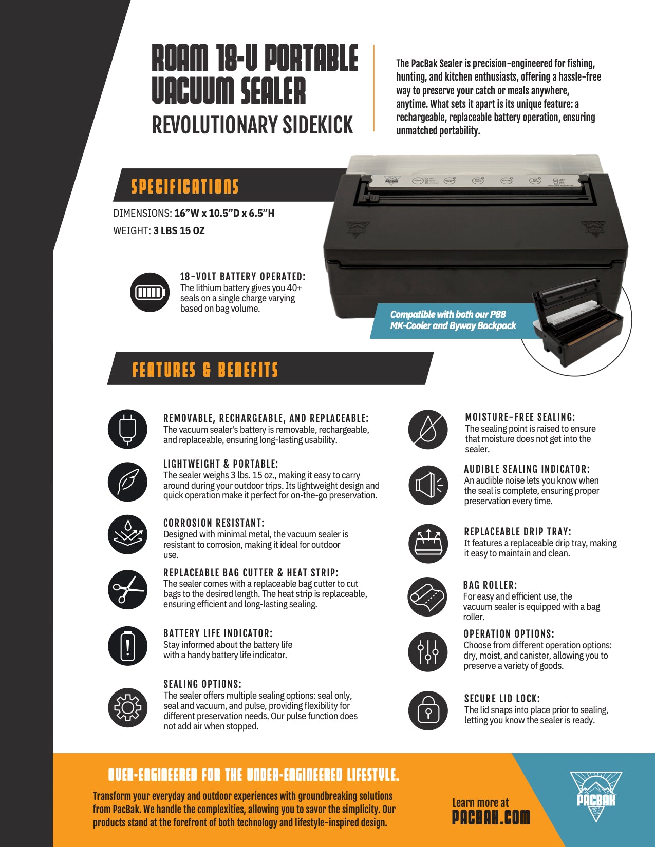 The ROAM 18-V Portable Vacuum Sealer ensures your food stays fresh, wherever adventure takes you. Its standout feature is the rechargeable, replaceable 14.6-volt battery, which charges rapidly in under an hour and offers the convenience of charging both inside and outside the sealer. This compact, lightweight vacuum sealer delivers over 40 seals per charge and is the ultimate solution for on-the-go preservation tailed for outdoor and culinary enthusiasts.